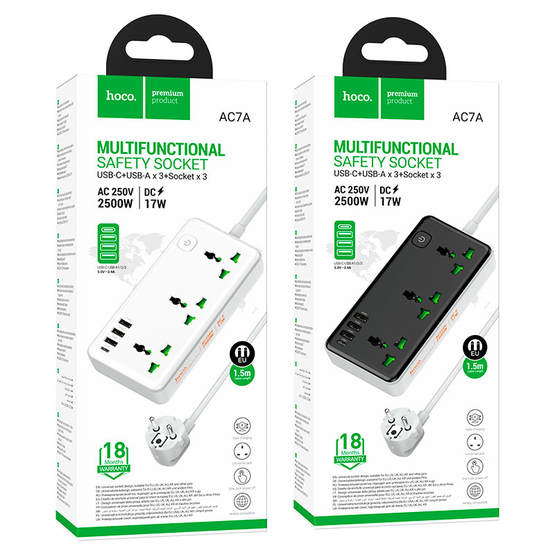 Сетевой фильтр HOCO AC7A (2500W / 3 евро-розетки / 3 USB / USB-C / 3 метра)