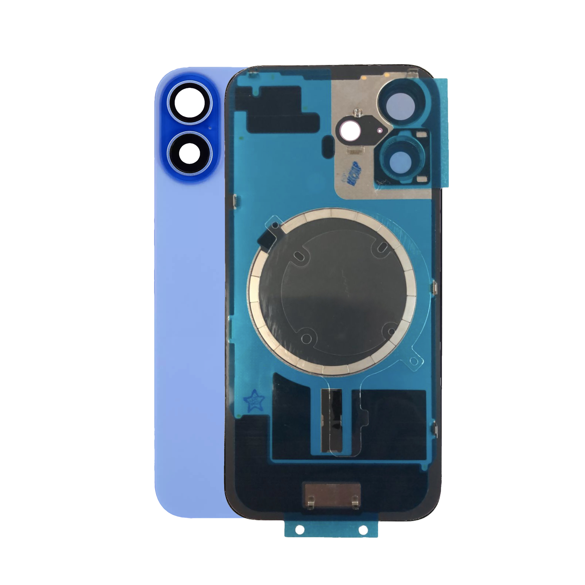 Задняя крышка (стекло) iPhone 16 (в сборе со стеклом камеры + рамка + магниты MagSafe) (Синий / Ultramarine) (Premium)